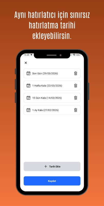 Hatırlatma tarihi geldiğinde SMS ve e-posta ile bilgilendirilirsiniz. Önemli hiçbir tarihi kaçırmazsınız.
