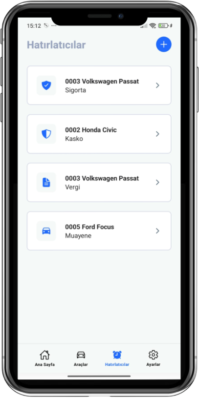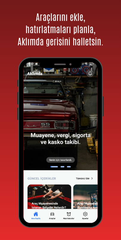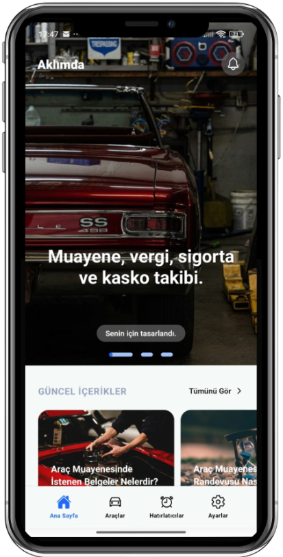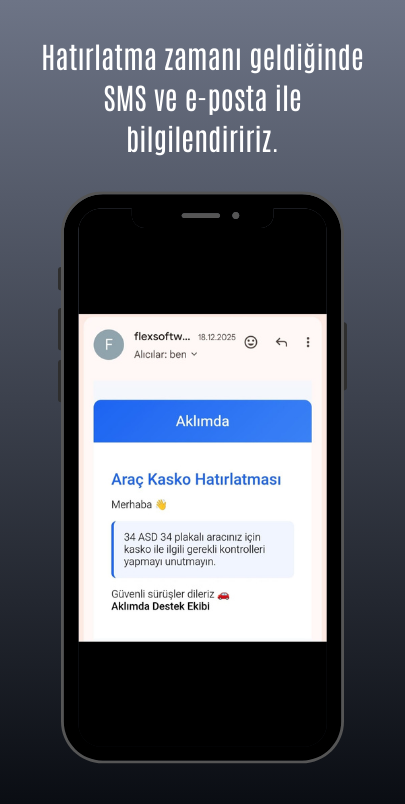Aklımda; araç muayenesi, sigorta, kasko ve vergi süreçlerini düzenli takip etmenizi sağlar. Tanımlanan tarihlerde SMS ve e-posta bildirimleriyle sizi zamanında bilgilendirir.