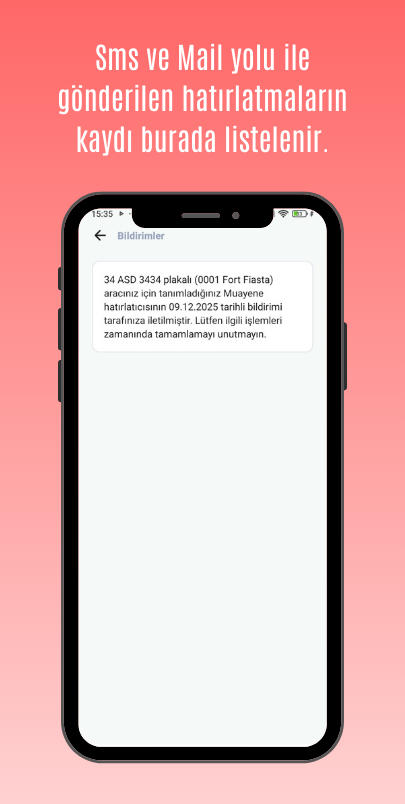Gönderilen tüm SMS ve e-posta hatırlatmaları uygulama içinde listelenir. Hangi araç için, ne zaman bildirim gönderildiğini görebilirsiniz.